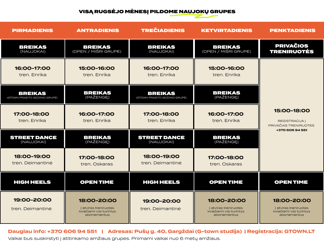 sezonas 2025/2025Treniruočių tvarkaraštis Čia rasite naujausią treniruočių tvarkaraštį. Naujokai gali prisijungti į treniruotes tvarkaraštyje pažymetais laukeliais (naujokai). Jeigu keistusi treniruočių laikas, visada būsite informuoti trenerių arba el. paštu. NAUJOKŲ REGISTRACIJA *Naujokai (0 lygis)– tai niekad nešokę ir norintys pabandyti. ĮSIDĖK Į SAVO KALENDORIŲ Pradėk dabarPrisijunk prie Breiko! Registruotis